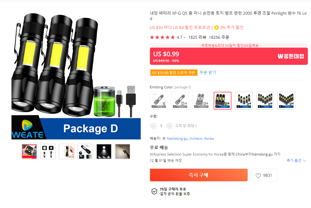 배송비 눌러서 무료배송으로 변경하면 $0.99에 구매 가능해요.